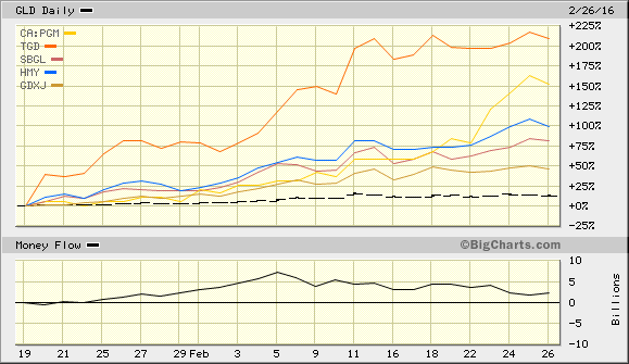 Ergänzend zum letzten Posting : Die zuletzt erwähnte Ausreisserin TMM sowie PGM, die erst seit wenigen Tagen im Depot ist, vs. Gold,GDXJ vs. den blendend performenden Südafrikanern HMY und SBGL....