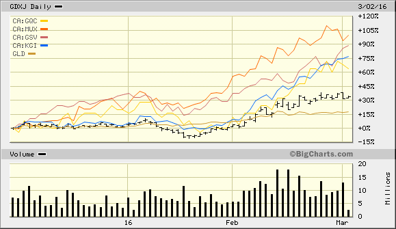 Aus Eigeninteresse habe ich die vorgenannten Depotwerte verglichen vs Gold und dem GDXJ ab dem 19.01. An diesem Tage erreichten alle Minenindices Mehrjahrestiefststände.