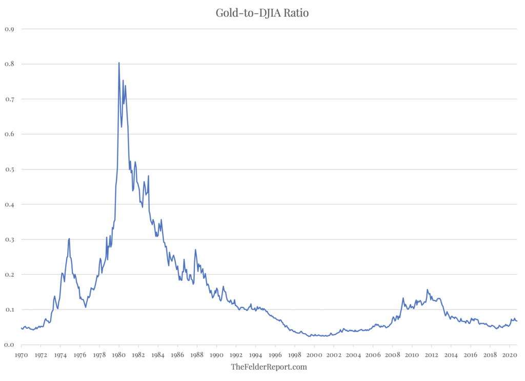 "Da der Goldpreis seit seinem Tiefststand vor fünf Jahren um etwa 100% gestiegen ist, scheinen einige Anleger der Meinung zu sein, dass er überteuert wurde. Neben der Beobachtung wichtiger Treiber des Goldpreises besteht eine Möglichkeit, seine Bewertung zu betrachten, darin, ihn einfach mit beliebten Alternativen zu vergleichen. Der Goldpreis im Vergleich zum Dow Jones Industrial Average scheint darauf hinzudeuten, dass er überhaupt nicht teuer ist. Tatsächlich müsste sich der Goldpreis gegenüber dem aktuellen Preis noch einmal verdoppeln, um den vor etwa einem Jahrzehnt erreichten Bewertungshöchststand zu erreichen. Damit läge der Goldpreis natürlich immer noch weit unter dem vor vier Jahrzehnten erreichten Höchststand. Das langfristige Aufwärtspotenzial von Gold scheint also selbst nach seinem grandiosen Lauf der letzten Jahre noch lange nicht ausgeschöpft."