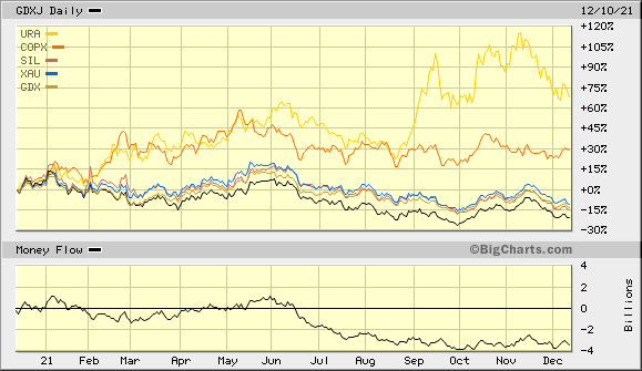 Längerfristig sind die Unterschiede wesentlich höher mit besserem Ausgang für Uran und Kupferaktien, 2.Chart.