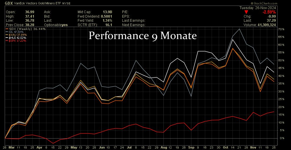 Ein interessanter Chart. Als Vorgeschmack stieg gestern der GDX um 2,4 %, der GDXJ um 3,0 % und 4 Goldaktien des Depots legten zw. 4 - 5 %; MUX um 9,3 % zu.