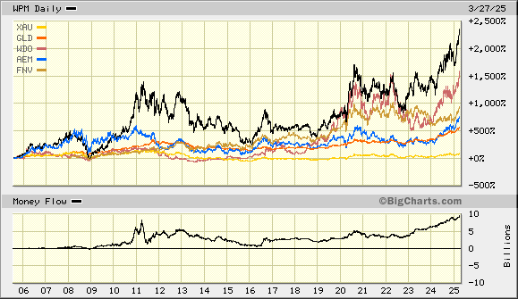 Sowohl die beiden großen Royalties WPM und FNV als auch der Goldriese AEM und der Goldjunior WDO haben Gold und XAU über 20 Jahre turmhoch übertroffen.