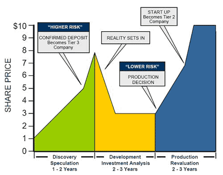 In the first phase, the exploration phase, a bunch of geologists with beards and picks (the former is not essential) set off for the hills. They drill some holes in the ground. After some months, years - or, as in most cases, never - lo and behold, one of them strikes gold. They drill some more and find more gold in the rock. Eureka! Everyone involved jumps for joy and the stock goes to the moon.