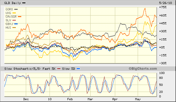 Hier Gold vs HUI ( Seniors / Großminen), GDXJ (Juniors / Kleinminen) Silber, HUI, 2 Depot-Goldzwerge UXG und SGR sowie dem schwersten Depotwert GORO.