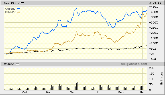 Einige davon glänzen durch sehr gute Kursentwicklung, allen voran GPR und SAC. Hier ein 6 M Vergleich zu Silber.