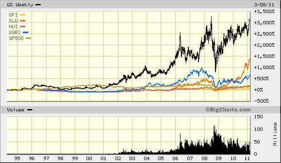 Hier mal ein Langfristvergleich einiger Minen/ Blue Chips (Goldcorp, Gold Fields, Silver Standard, Silver Wheaton) zu HUI und S&P500, leider erst ab 1994. Sehr gute Minen – auch dynamisch geführte Depots – schlagen die Indices deutlich.