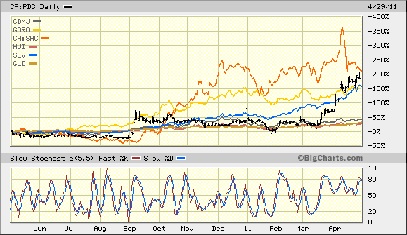 Umso interessanter mal zwischendurch ein Vergleich der größten Stammpositionen GORO, PDG und SAC versus Minenindices und Gold und Silber : Alle 3 brauchen sich selbst hinter dem extrem gelaufenem Silber nicht zu verstecken, erst recht nicht im Vergleich zum schnellen GDXJ oder Gold und HUI.