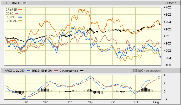 Zunächst beschränke ich mich auf diese Frage, Liberty. Sie ist zu beantworten mit einem Chartvergleich. Deutlich die Parallele zu 2008, wo ebenfalls die Minen stärker einbrachen als Gold.