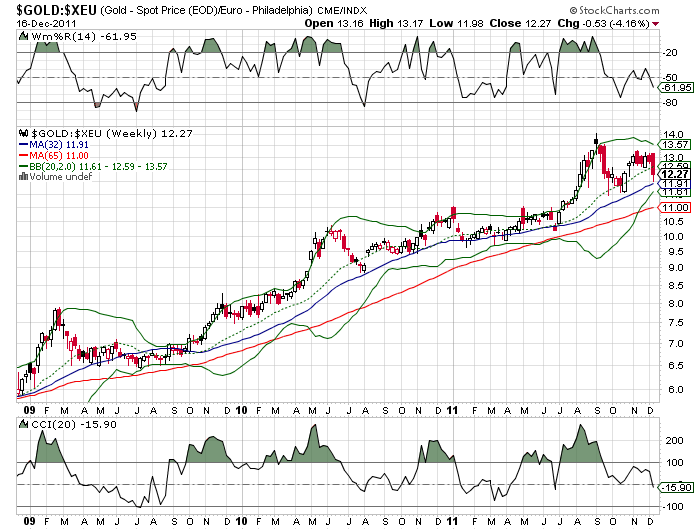 Ergänzend der gleiche Chart, wie zuvor besprochen, aber in € Gold. Nicht so überverkauft wie $ Gold, hinzugenommen die 32 MA wkl, an der Gold entlangläuft...