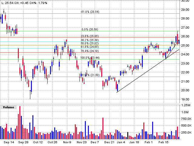 Bei SIL habe ich mal Fibonacci Retracements für den Anstieg seit Mitte Februar bis zum gestrigen Top eingebaut beim Chart (arithm.). Interessanterweise war exakt bei 50 % Schluss. Nach dieser jetzigen Erholung könnte dann noch die 61.8 % anvisiert werden. Da leg ich jetzt mein Augenmerk darauf. Dies könnte dann exakt mit der Aufwärtsttrendlinie zusammentreffen. Dies wäre dann rund 24.66 bei SIL und würde auch bei einzelnen Silberaktien wie EXK oder SSRI passen.