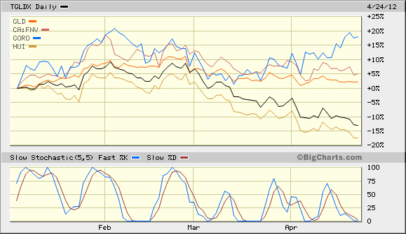 Rechts daneben ein Vergleich einiger Werte vs Stand 30.12.2011 . Während YTD die Edelmetalle, ausg.Palladium, im Plus liegen, sind die Minen sehr schwach, von einigen Ausnahmen abgesehen. Darüber später mehr.