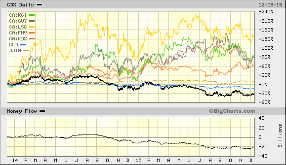 In einem weiteren Chart habe ich dem GDX und Gold gegenübergestellt 5 Depotschwergewichte.