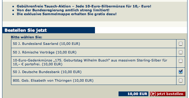 Immerhin bekomme ich die Bundesbank aber zweimal: Einmal normal und ohne Porto und einmal mit der Gratis-D-Mark aber dafür 1,50 Euro Porto.