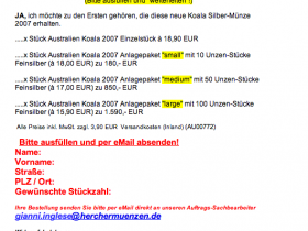 Danach werden Sie unverbindlich in die Reservierungsliste aufgenommen und bekommen in monatlichen Abständen je eine weitere Gedenkmünze der Collection "Die kleinsten Goldmünzen der Welt", immer für 14 Tage zur Ansicht mit garantiertem Rückgaberecht!