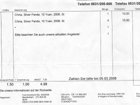 Da kann man bei allen Vorbehalten nicht meckern - 5 andere Münzhändler hätten mir ne Rechnung geschickt, mich das Geld zahlen lassen und dann erklärt, das der Panda ausverkauft ist. Hier bekomme ich die Ware super schnell gegen Rechnung mit Zahlungsziel 2 Wochen. Das ist fast schon außergewöhnlicher Service.So, und bei der Gelegenheit verusche ich auch gleich die Frage nach der Bestellnummer zu beantworten. Habe hier eine Rechnung mit