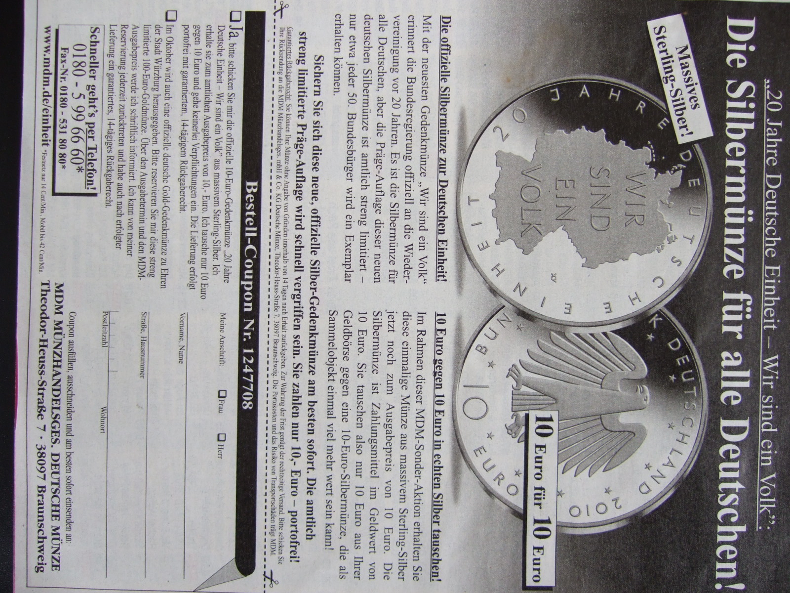 Ich bin mir z.Zt. am überlegen das Angebot von MDM die kommende Ausgabe der 10€-Gedenkmünze (max 5 Stück pro Person) zu bestellen. 10€ Papier gegen 10€-Münze (Ohne Portokosten!)