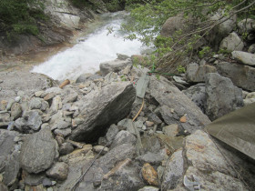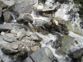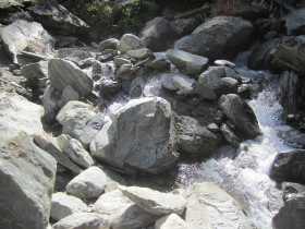Die Gegend sieht verlockend aus. Ich würde die Flußverhältnisse und Wasserzugangsmöglichkeiten (in den Bergen als Unkundiger oft gar nicht so einfach) auf jeden Fall wesentlich weiter oben erkunden und einige günstige Bereiche intensiv beproben. Nach erfolglosen Versuchen wandert man gerne ein relativ weites Stück bis zur nächsten Stelle. Diesen Fehler machte ich anfangs ebenfalls und mußte mehrmals feststellen, dass ergiebige Goldseifen nur wenige Meter von den fast goldlosen und aufgegebenen Stellen entfernt lagen.