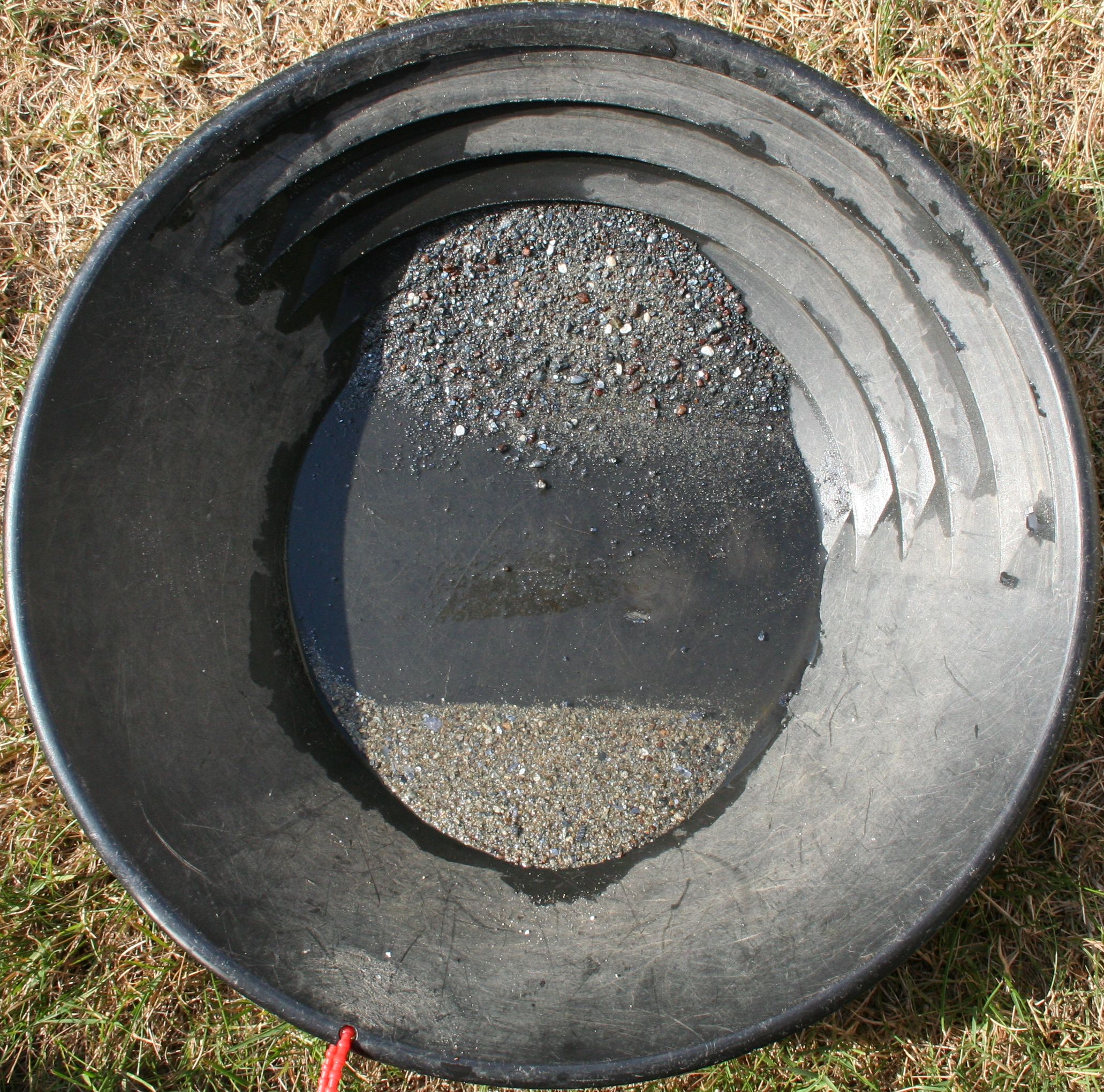 Im Nachgang zeige ich noch zwei Fotos vom "schwarzen Sand", der aus den goldanzeigenden Schweremineralen besteht. Weil es sich bereits um relativ reines Waschkonzentrat handelt, konnte ich nur noch wenig hellen/leichten Sand hieraus auswaschen und auf der unteren Pfannenseite platzieren. Im oberen black sand - den übrigens sehr feines Gold/Goldstaub nur schwer durchdringen kann - befinden sich noch hunderte Goldpartikel. Will man auch die kaum noch sichtbaren Staubpartikel erwischen, sollte das Material pro Waschgang deutlich reduziert werden - andernfalls ginge selbst beim vorsichtigsten Auswaschen einiges verloren. Diese Partikel sind so klein und leicht, dass sie sogar auf dem Waschwasser wegen seiner Oberflächenspannung schwimmen können. Daher wird in diesem Feinstbereich das Waschwasser mit etwas Spülmittel entspannt.