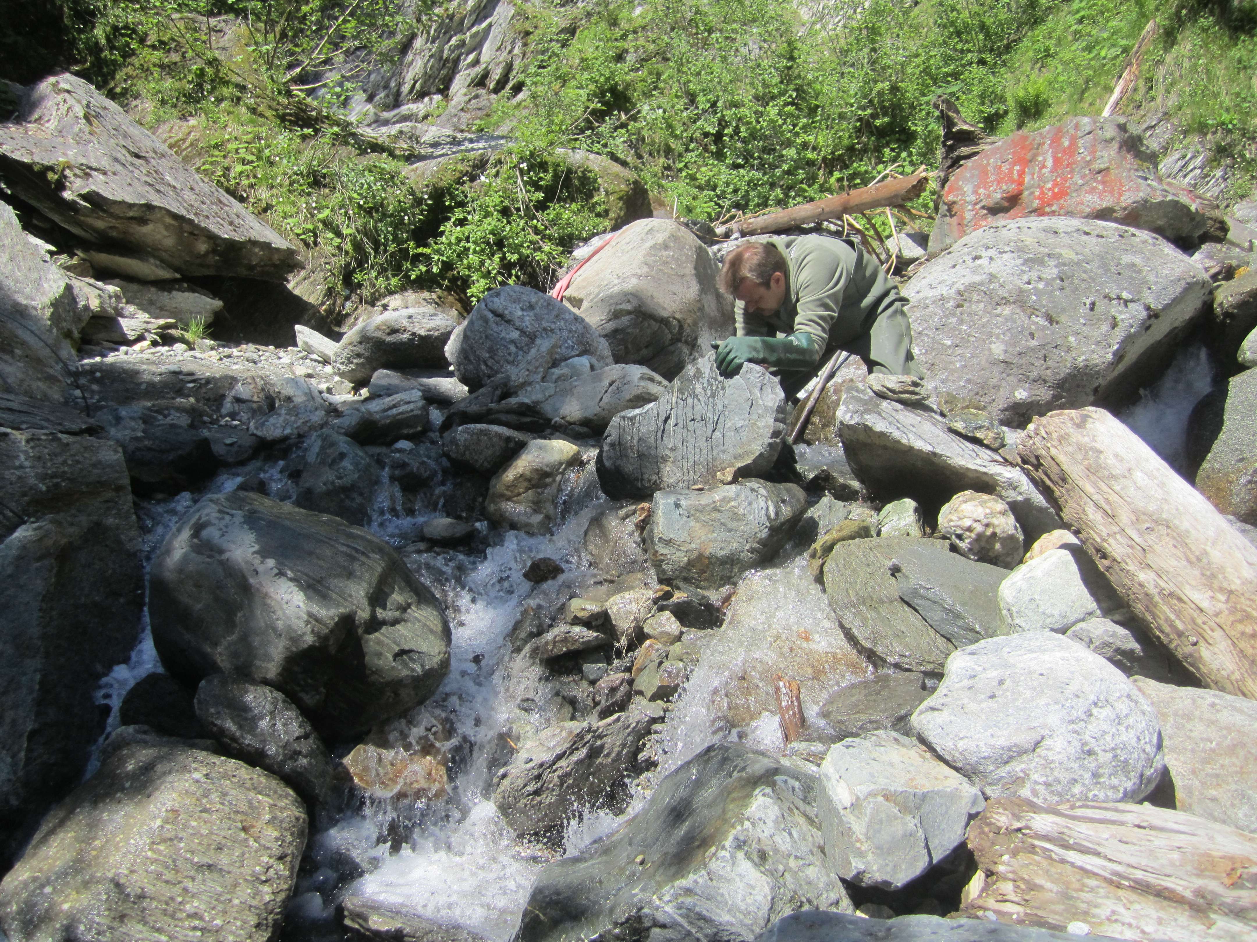 Der Einsatz von Metalldetektoren lohnt gem. meiner Erfahrung mit unzähligen Sondeneinsätzen in Bächen kaum, weil die etwas größeren Objekte der Begierde zu selten vorkommen, überwiegend zu tief liegen und unzählige oberflächlich liegende Steine den erforderlichen Schwenkbereich dicht über dem Bachkies erheblich einschränken und somit die sondenspezifische Suchtiefe erheblich verringern. Liegt der nackte Fels frei/fast frei kann man es probieren - jedoch wurden diese Stellen i. d. R. leider mehrfach gründlich abgesucht. Zur Kontrolle des Grabungsbereiches (speziell unter Wasser) und des vorgesiebten Materials - sofern diese Methode Anwendung findet - gibt ein Metalldetektor letzte Sicherheit.