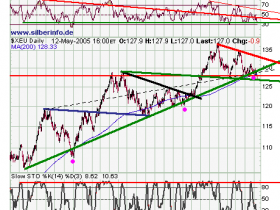 - seit 2005 steigt euro-goldpreis im Zuge einer Impulsbewegung nach 4 Wellen innerhalb eines 3ecks, mit Ziel, den oberen Schenkel zu brechen und in einen Thrust ("definitive" "Abkopplung") überzugehen.