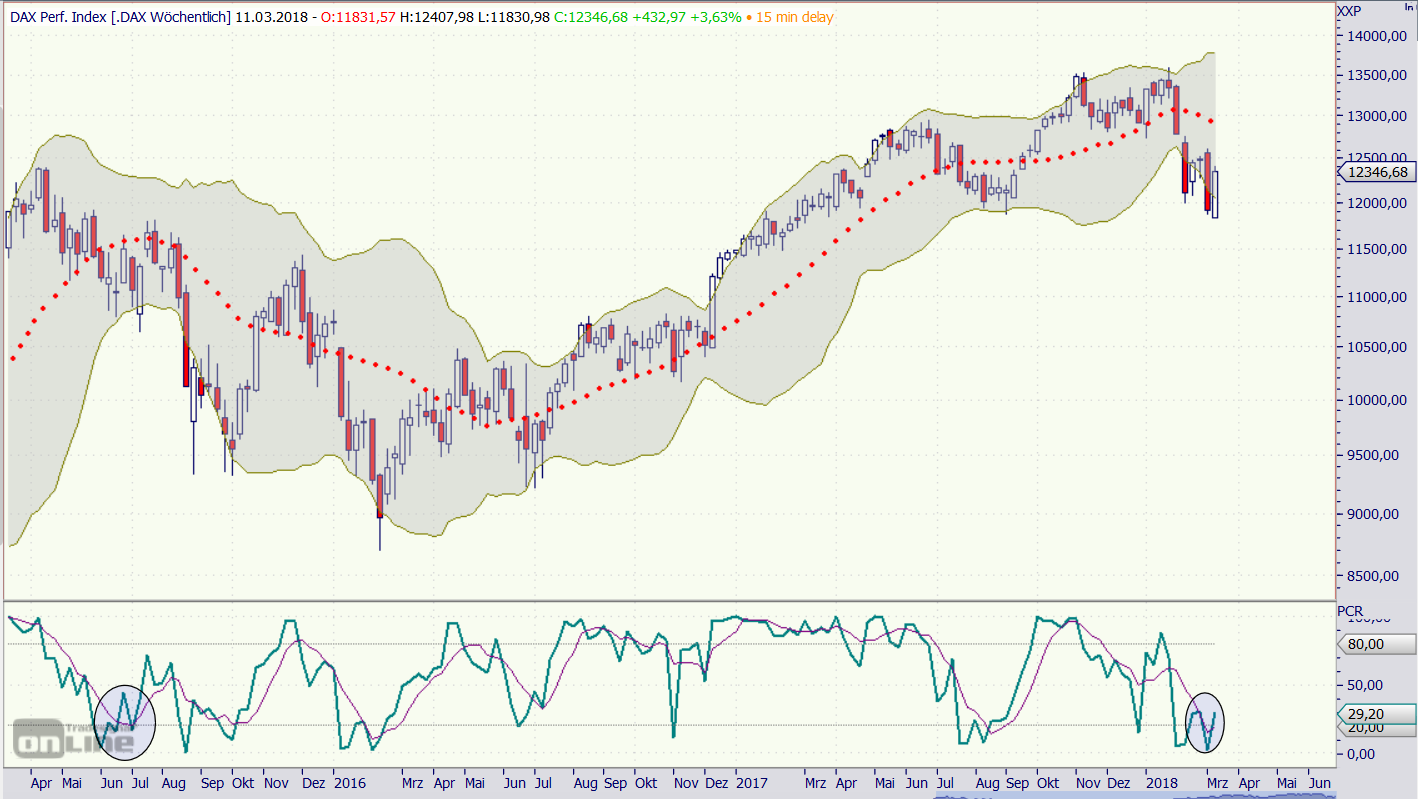 Der Momentumindikator im Dax Wochenchart steigt leicht an. Der Optimist sieht eine Trendwende. Es könnte jedoch nur eine Gegenreaktion analog Juni/Juli 2015 sein.