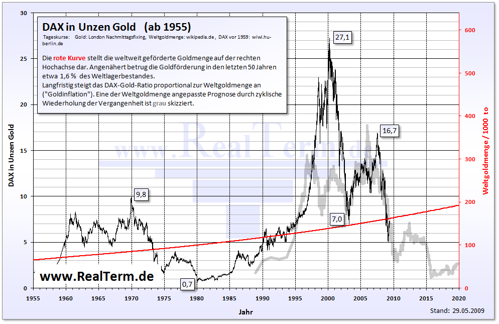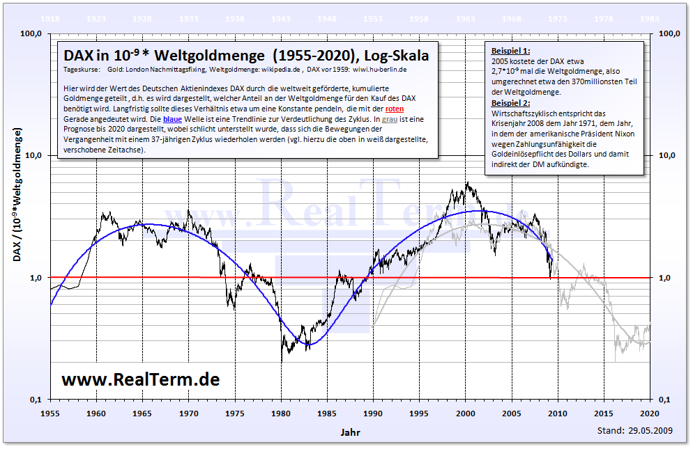 Schaut Euch die Graphen und Prognosen von RealTerm/Minos an ein paar Einträge davor an. Wenn der DAX/Gold diesen annährend folgen sollte, dann dürften wir in 2010 ein DAX/Gold = 4 bis 3 sehen.