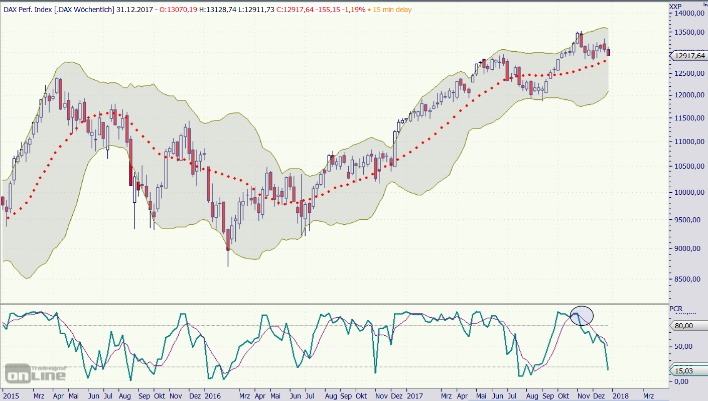 Der Momentumindikator im Dax Wochenchart steigt leicht an. Der Optimist sieht eine Trendwende. Es könnte jedoch nur eine Gegenreaktion analog Juni/Juli 2015 sein.