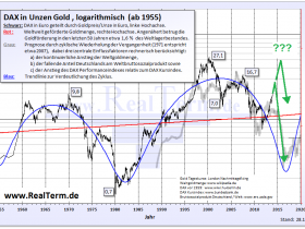 Aus der Historie und den aus den geänderten Rahmenbedingungen von mir angebrachten Korrekturen wäre DAX/Gold heute bei ca. 8 "fair" bewertet... Ich rechne konkret mit einem DAX/Gold kleiner 2, also einem Wert weit weg vom fairen Wert. Die aktuelle Phase ist also, wenn ich recht behalte, nur ein kleines, schmerzhaftes Zwischenspiel auf dem Weg des DAX/Gold nach unten.
