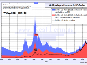 Du findest zunächst den nominellen Goldpreis als schwarze Linie. Da aber die Kaufkraft des Dollars schwindet ist diese Linie sinnlos.