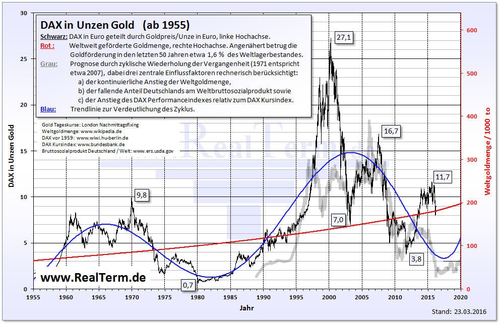 Vom Prinzip könnte der DAX seine 0,7 wieder erreichen, allerdings haben sich die Rahmenbedingungen (Goldmenge, Anteil Wirtschaftskraft DAX am Welt-BSP und vor allem der Dividendenanteil des DAX-Standes [DAX=Performance-Index!] geändert. Meine Abschätzung ergibt unter Berücksichtigung all dieser Faktoren, dass der DAX/Gold seinen alten Stand aus 1980 heute wieder erreicht hätte, wenn er unter 2 fallen würde. Allerdings ist diese Abschätzung wirklich nur eine Schätzung und letztlich ist es auch egal , ob "1" oder "2", das Prinzip und die Größenordnung sind wichtig.