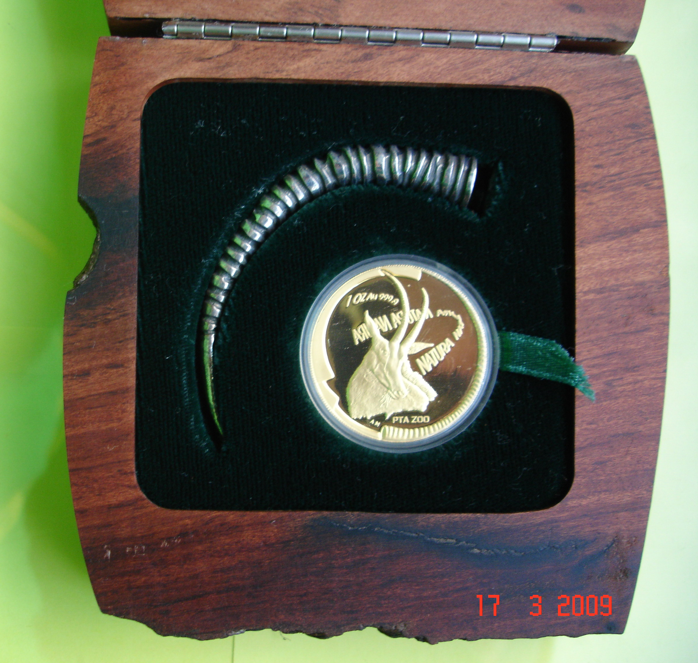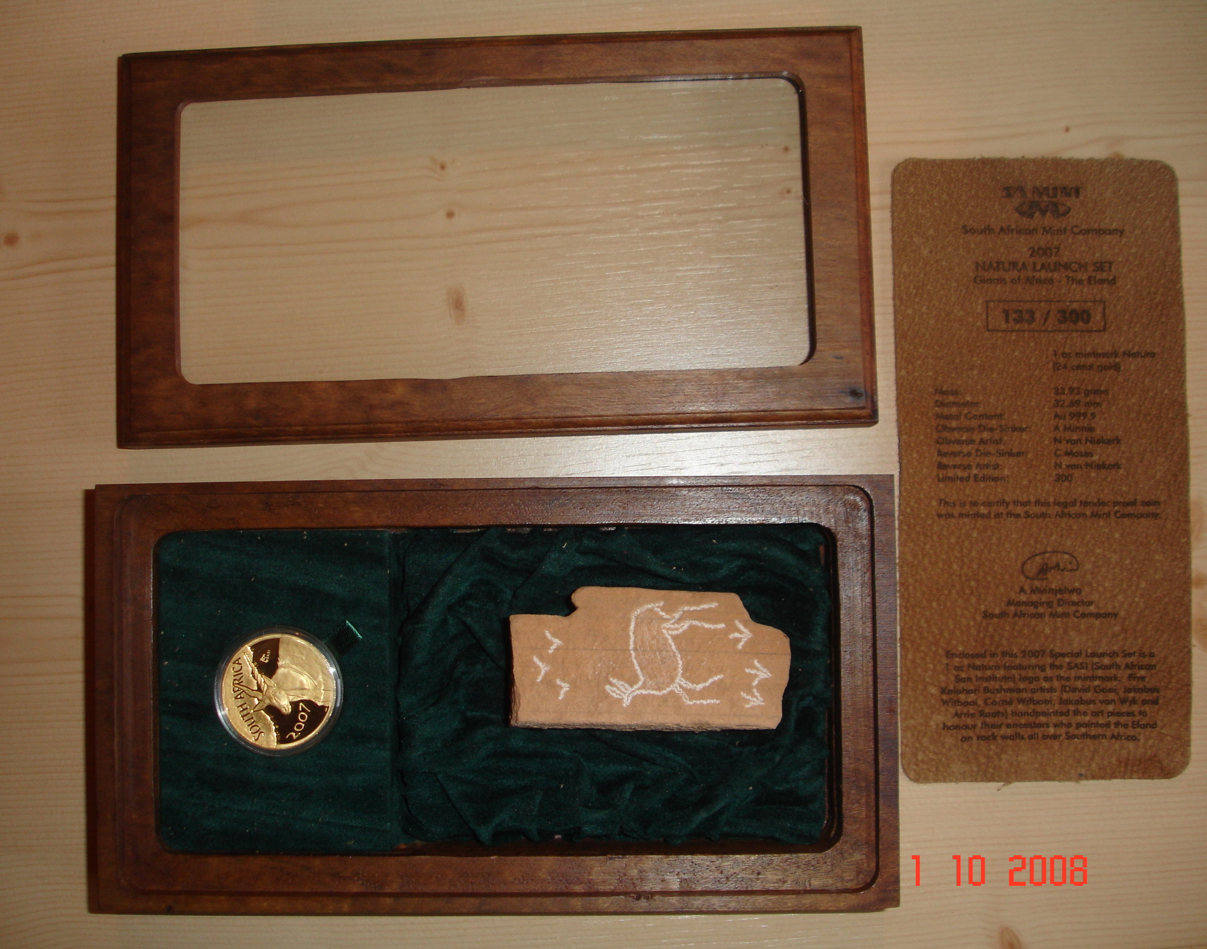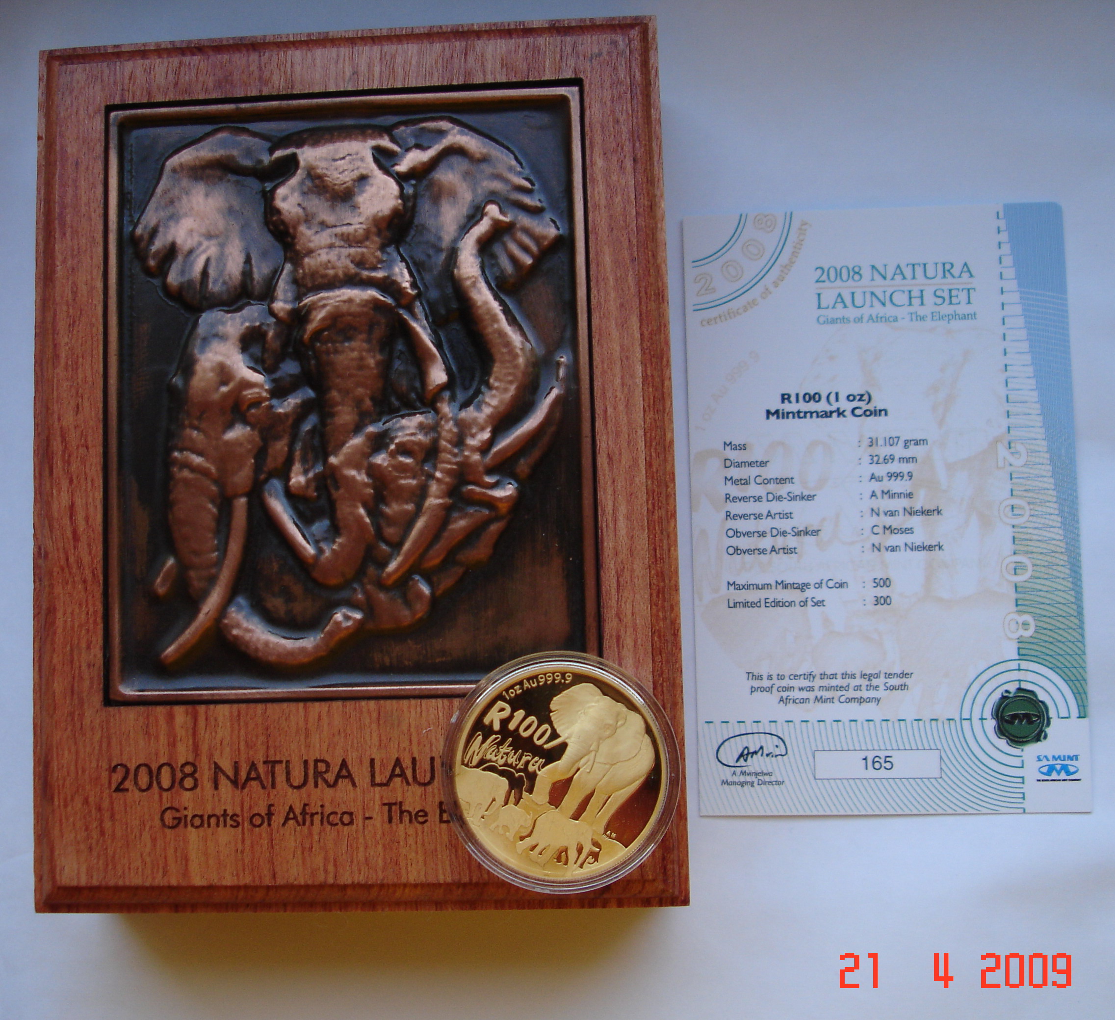 Wie gesagt, das hier ist "nur" die 1 oz 2008 Elephant ... aber in einer sehr schönen wooden box mit Zugabe, von daher teurer als eine 1 oz single coin in der green SA Mint box.