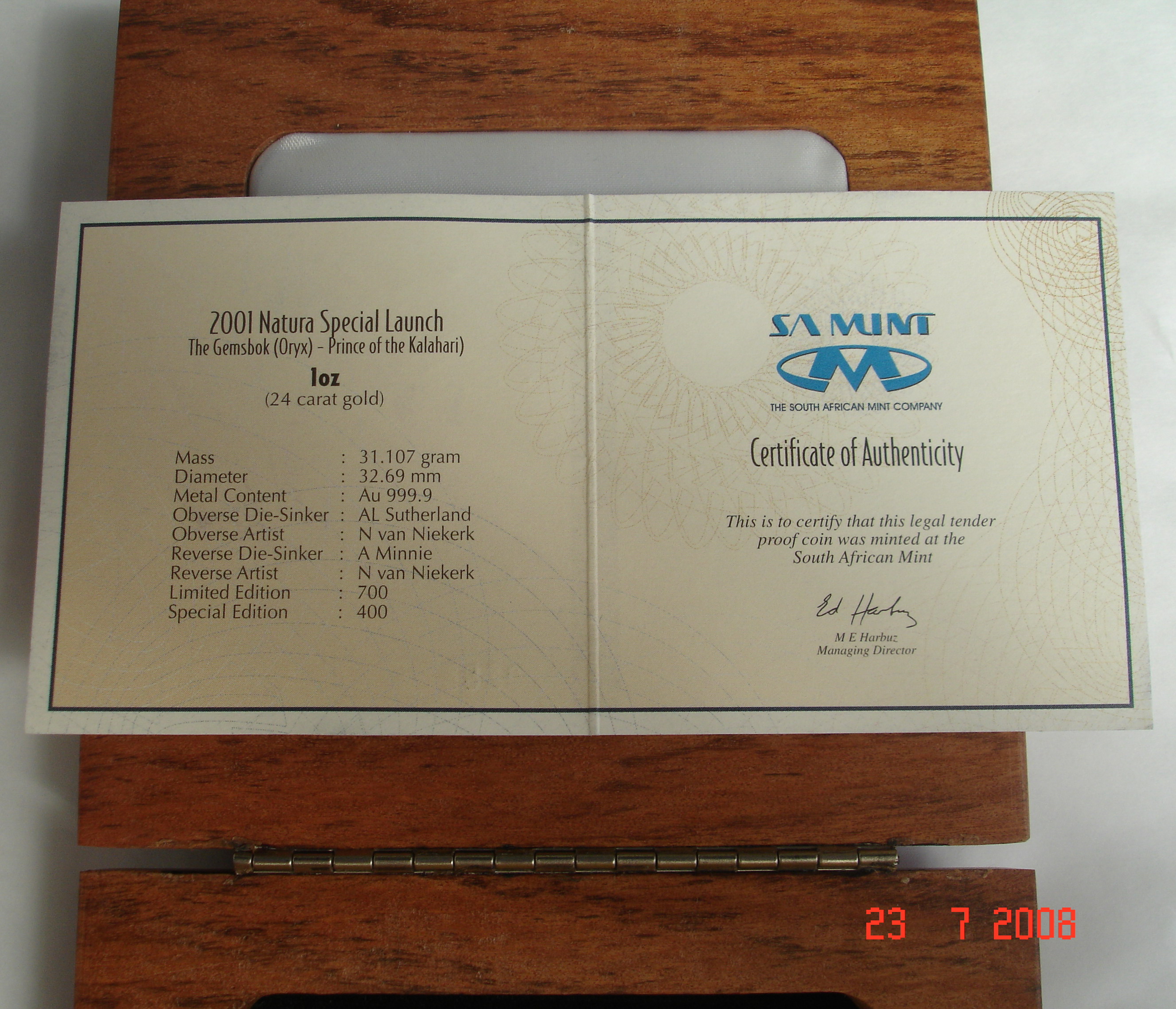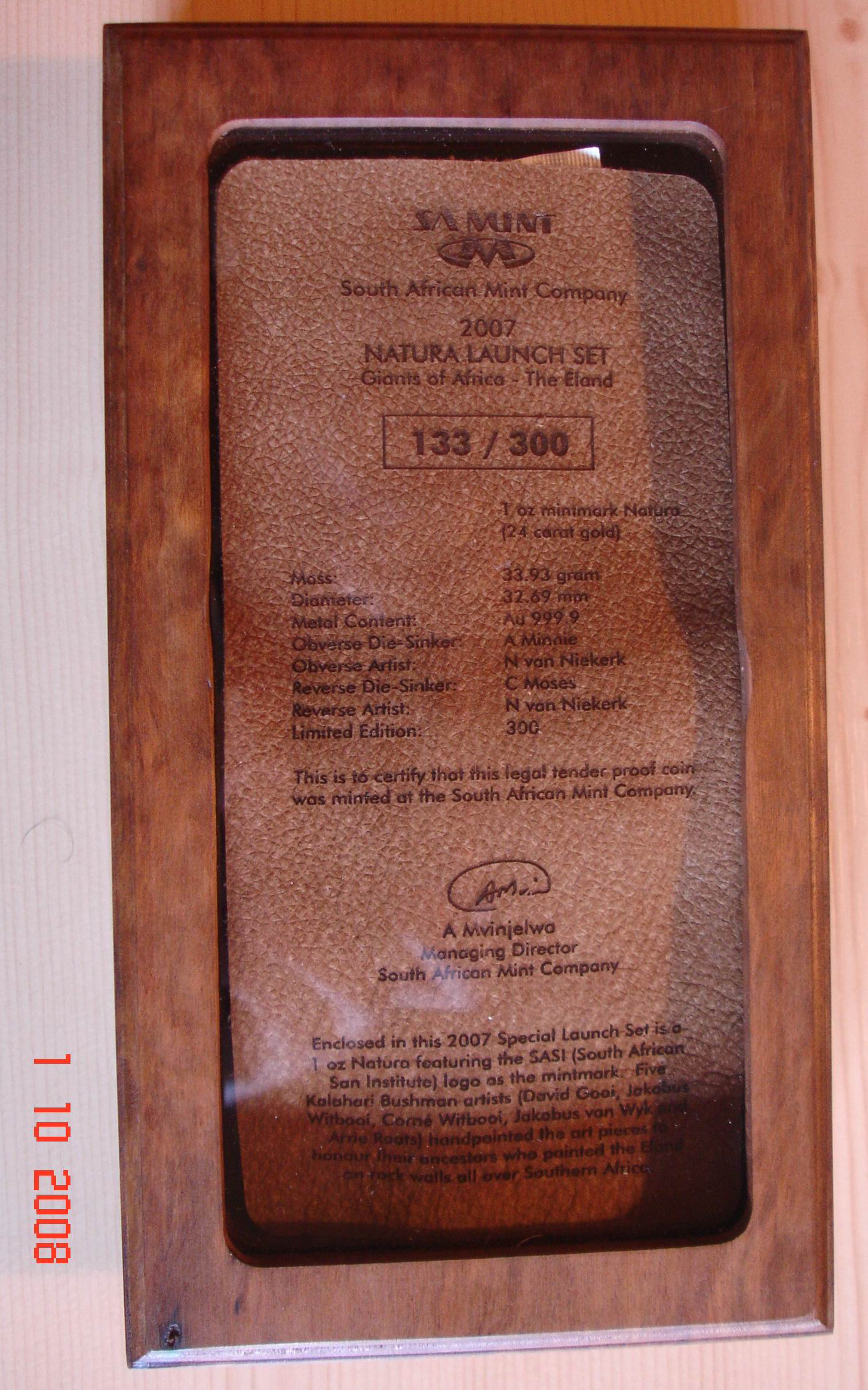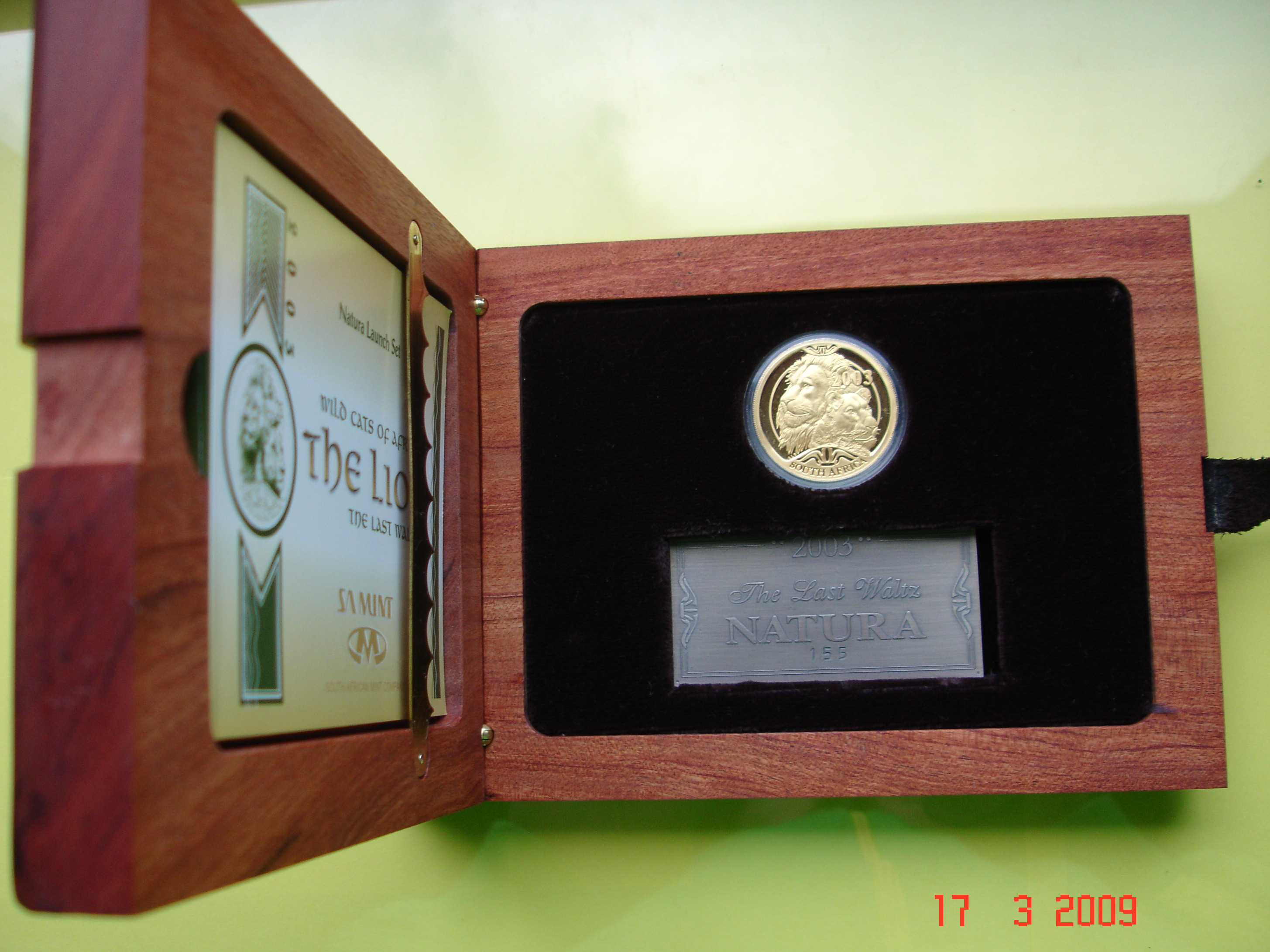 Wie gesagt, das hier ist "nur" die 1 oz 2008 Elephant ... aber in einer sehr schönen wooden box mit Zugabe, von daher teurer als eine 1 oz single coin in der green SA Mint box.