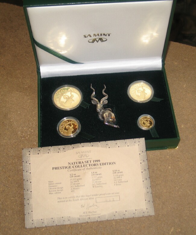 Bei den Natura PRESTIGE Sets gibt es eine komplette durchgehende Serie von 1994 bis heute 2010, jedes Jahr mit einem anderen Tier und 4 zusammengehörenden unterschiedlichen Coins der Tierfamilie also 1 oz, 1/2 oz, 1/4 oz und 1/10 oz. Und die Sammlergemeinde ist hier nicht nur in Südafrika sehr groß.