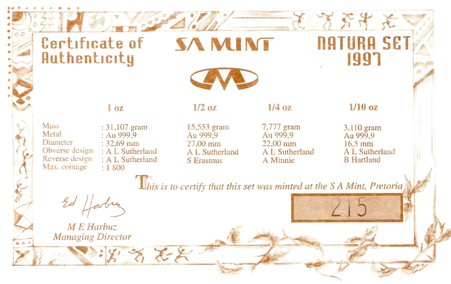 In der Tat gibt es Natura Proof Sets in einer Leatherette Box mit Auflagen bis zu 1750 Sets. Diese Proof Sets wurden aber nur von 1994 bis 2008 von der SA Mint verkauft. Ab 2009 gibt es nur noch Natura Prestige Sets. Die Auflagen sind höher, die Sets liegen näher am Gold Spot Preis. Die Sammler-Nachfrage ist nicht so hoch wie bei den Prestige Sets.