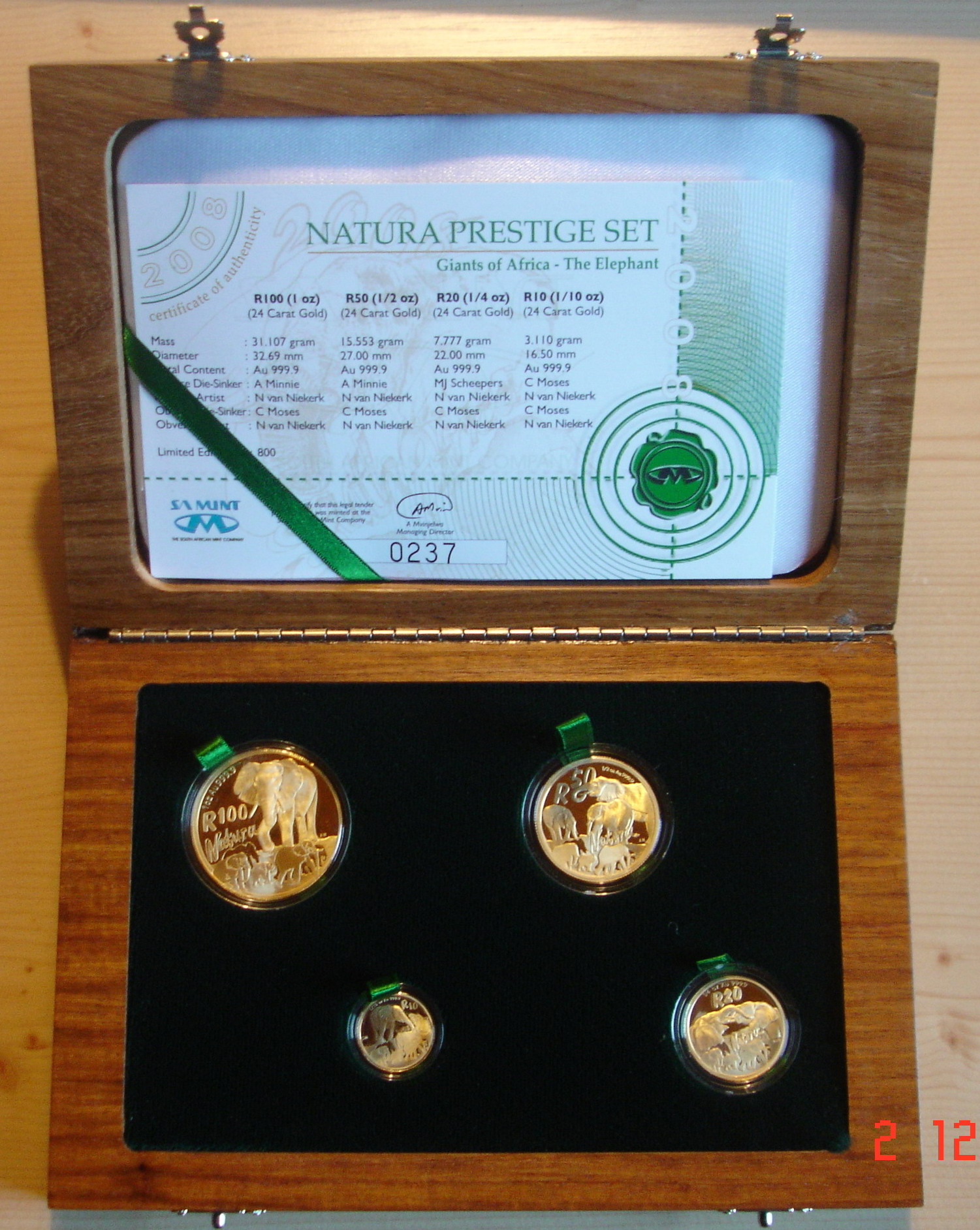 In der Tat gibt es Natura Proof Sets in einer Leatherette Box mit Auflagen bis zu 1750 Sets. Diese Proof Sets wurden aber nur von 1994 bis 2008 von der SA Mint verkauft. Ab 2009 gibt es nur noch Natura Prestige Sets. Die Auflagen sind höher, die Sets liegen näher am Gold Spot Preis. Die Sammler-Nachfrage ist nicht so hoch wie bei den Prestige Sets.