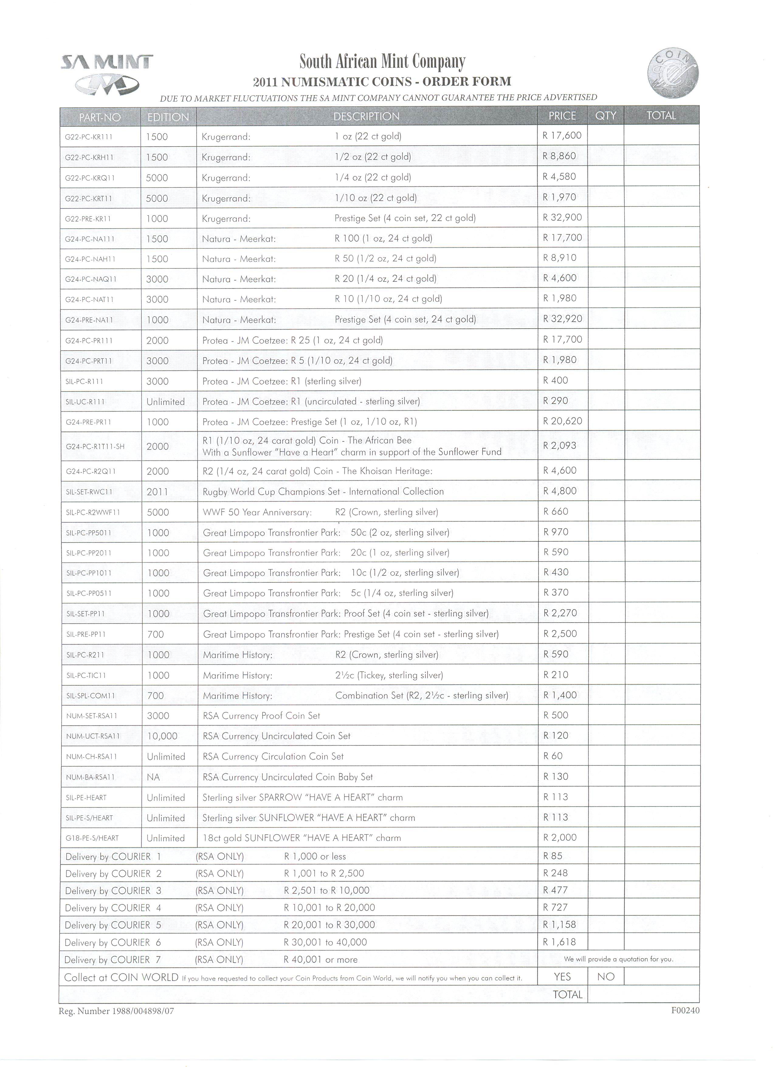 zum 2. Mal in 2011 hat die SA Mint nun ihre Ausgabepreise für NATURA- und KRUGERRAND- Münzen und Sets erhöht.