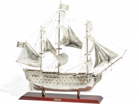 Silber mit partieller Vergoldung. Detailgetreues Modell des Dreimasters H.M.S. Victory, dem Flaggschiff von Vizeadmiral
