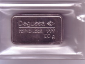 Degussa Feinsilberbarren 1x 50 Gramm, 1x 100 Gramm. Diese sind in letzter Zeit recht rar geworden und werden fast immer ueber den Silberpreis (bei Ebay) gehandelt: