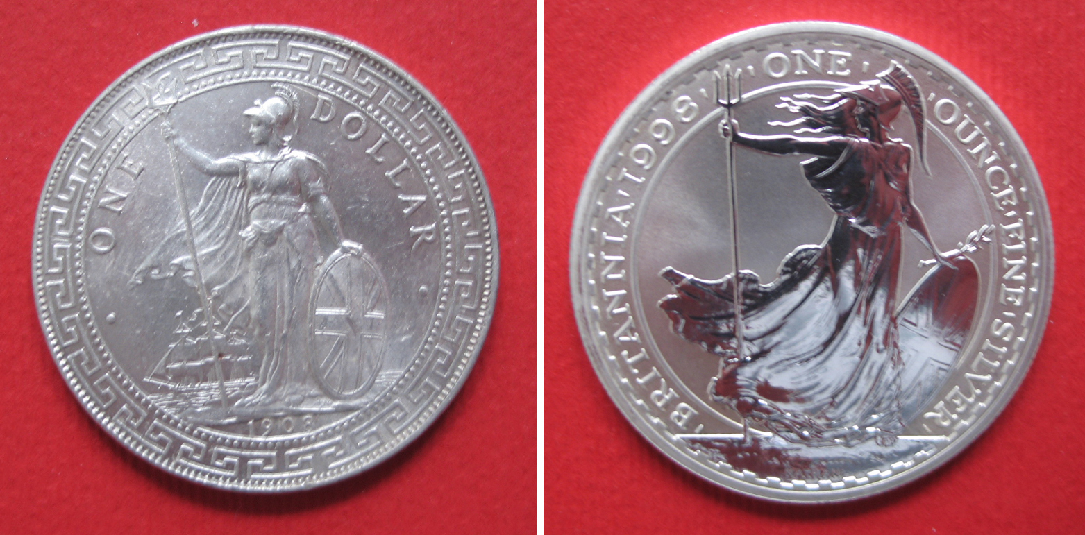 Britannia auf Trade Dollar 1908 und auf One Ounce 1998