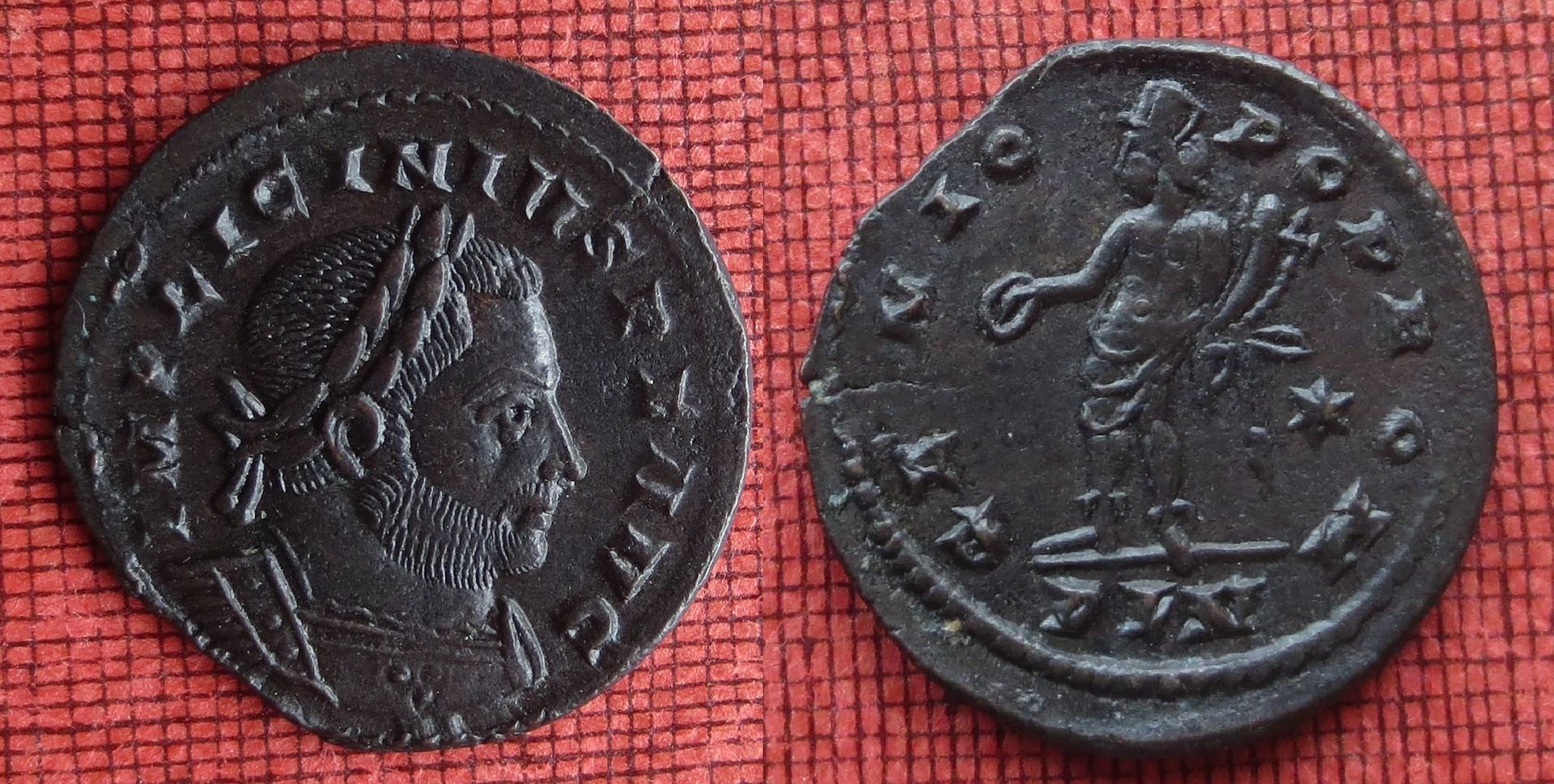• Bei den "alten Römern" brauchte man übrigens gute Ohren, weil die Metallgehalte in den einzelnen Münzen hörbar schwanken und man auch noch geringe Silbergehalte hören kann. So war man denn in der Lage, Stücke mit höherem Gehalt auszusortieren. Die beiden Gallienus-Münzen enthalten das Silber fast nur auf der Oberfläche; ich vermute mal etwa ein Prozent im Kern. Die Farbe kann extrem täuschen. Der als Bronzemünze mit Silberüberzug in London emittierte Follis hingegen klingt so, als ob er, wie der Antoninian des Aurelius, etwa 5 % Silber beinhaltet.