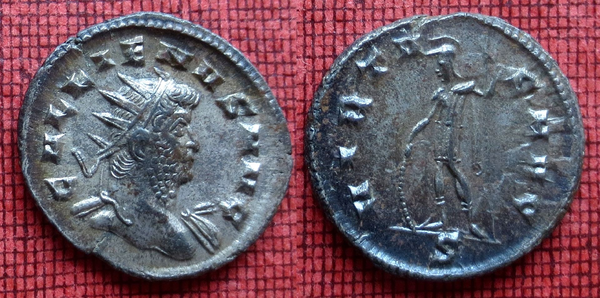 • Bei den "alten Römern" brauchte man übrigens gute Ohren, weil die Metallgehalte in den einzelnen Münzen hörbar schwanken und man auch noch geringe Silbergehalte hören kann. So war man denn in der Lage, Stücke mit höherem Gehalt auszusortieren. Die beiden Gallienus-Münzen enthalten das Silber fast nur auf der Oberfläche; ich vermute mal etwa ein Prozent im Kern. Die Farbe kann extrem täuschen. Der als Bronzemünze mit Silberüberzug in London emittierte Follis hingegen klingt so, als ob er, wie der Antoninian des Aurelius, etwa 5 % Silber beinhaltet.