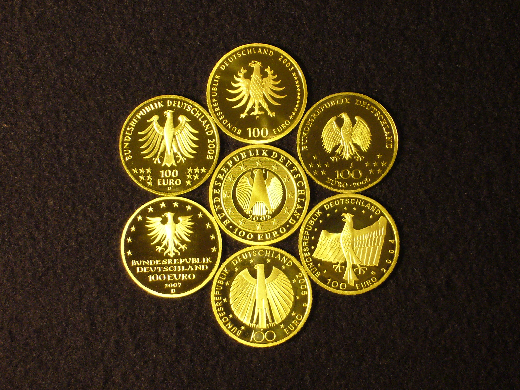 Hier mal drei Bilder von den deutschen Goldeuros. Sieht auch dann noch schön aus, wenn der Goldkurs von Phantasie-Zertifikaten gedrückt wird. Lasst Euch nicht unterkriegen, Goldbugs... Ihr seid die Hoffnung!