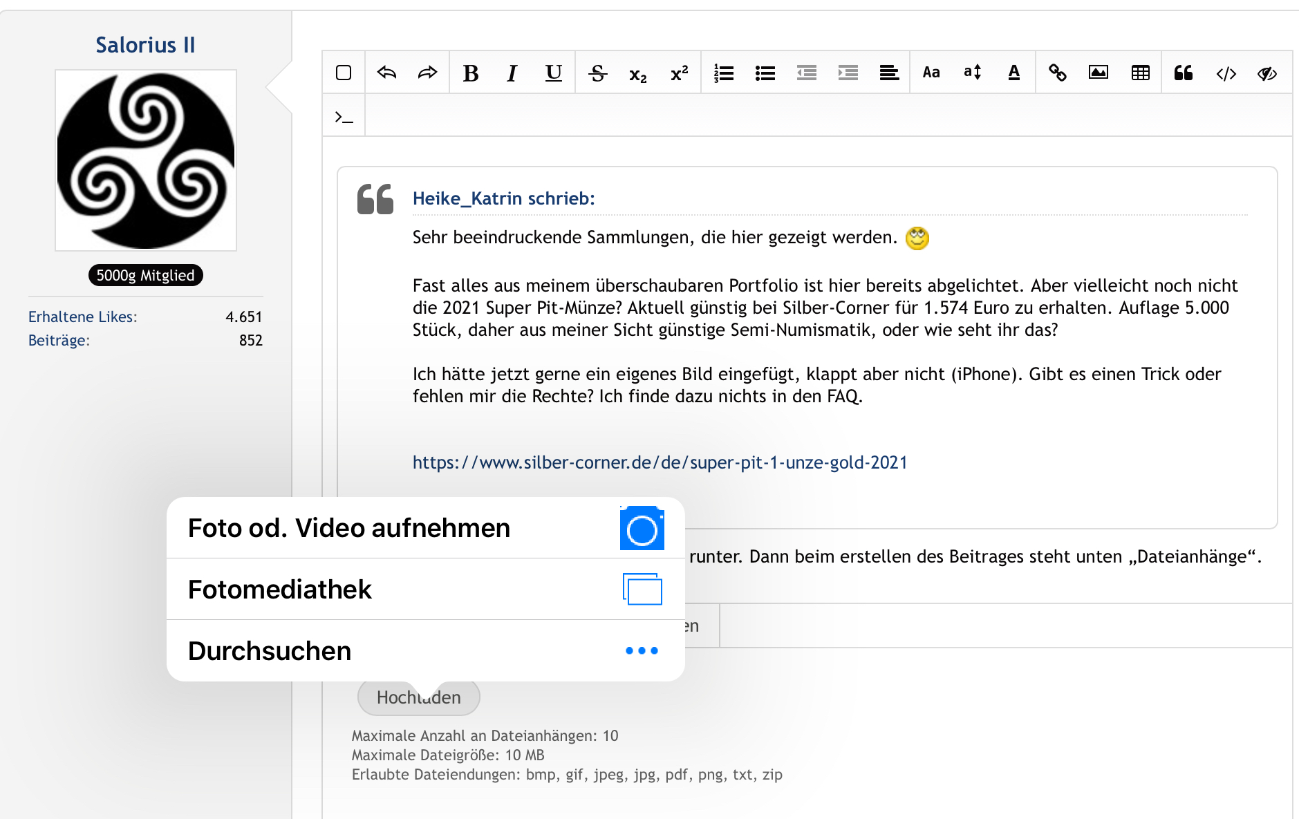 Ich hätte jetzt gerne ein eigenes Bild eingefügt, klappt aber nicht (iPhone). Gibt es einen Trick oder fehlen mir die Rechte? Ich finde dazu nichts in den FAQ.