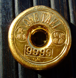 Admiral, das ist wohl ein alter Goldbarren, als Münze dürfte er nicht in Gebrauch gewesen sein, dann würde er bei einem Feingehalt von 9999 wohl weit mehr Gebrauchsspuren aufweisen.