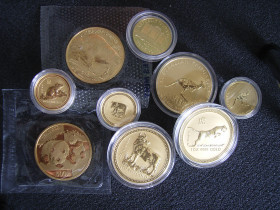 Und wo wir schon beim Golde sind... Hier mal ein Foto, auf dem verschiedene 1-Unzen-Stücke zusammen kommen. Ein bisschen verspielt, aber mir macht’s Spaß.