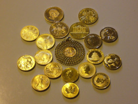 Und wo wir schon beim Golde sind... Hier mal ein Foto, auf dem verschiedene 1-Unzen-Stücke zusammen kommen. Ein bisschen verspielt, aber mir macht’s Spaß. Und ja, ich weiß, dass die 100 Kronen keine richtige Unze sind, aber sie passen so gut zu den Philharmonikern... Das in der Mitte ist ein Souvereign mit einer Goldkette darum gelegt.