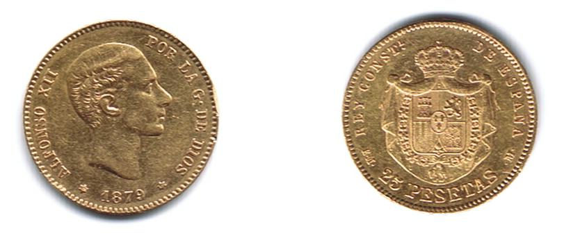 nachdem ich mir die ganzen Bilder hier angesehen habe und schwer begeistert war, möchte auch ich etwas beitragen. Hier also ein Bild meines ersten und bisher einzigen Goldstücks. Es handet sich um 25 spanische Pesetas 1879 (geprägt 1879); 900er Gold; ca. 7,25g fein.