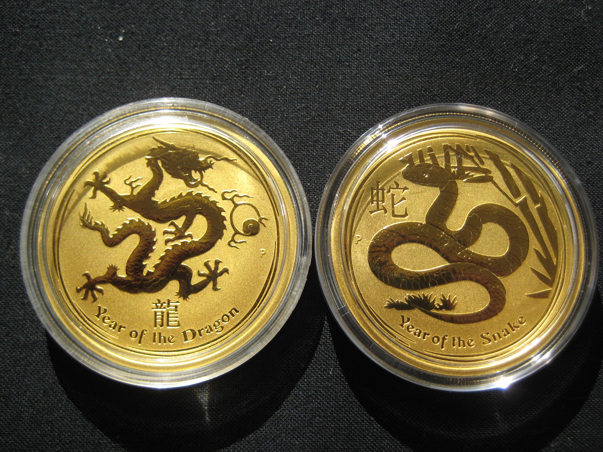 • Ich musste mal mit meiner neuesten Erwerbung herumspielen, und für frei Hand ohne besondere Beleuchtung gehts doch schon ganz gut. Als Motiv mussten die winzigen Zentelunzen von Discover Australia 2008 Gold und Platin herhalten. Bei der extremen Vergrößerung sieht man leider jedes Staubkörnchen und am Rand verzerrt Weitwinkel+Makrolinse ordentlich.