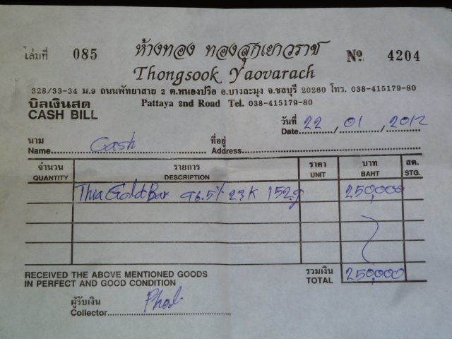 Ein paar Anmerkungen zum Goldhandel hier in Thailand. Das Gold hier hat grundsätzlich einen Feingehalt von 96,5 % und wird üblicherweise in kleinen Stückelungen meist als Schmuck bzw. Ornament Gold gehandelt, daneben gibt es aber auch Goldbarren.