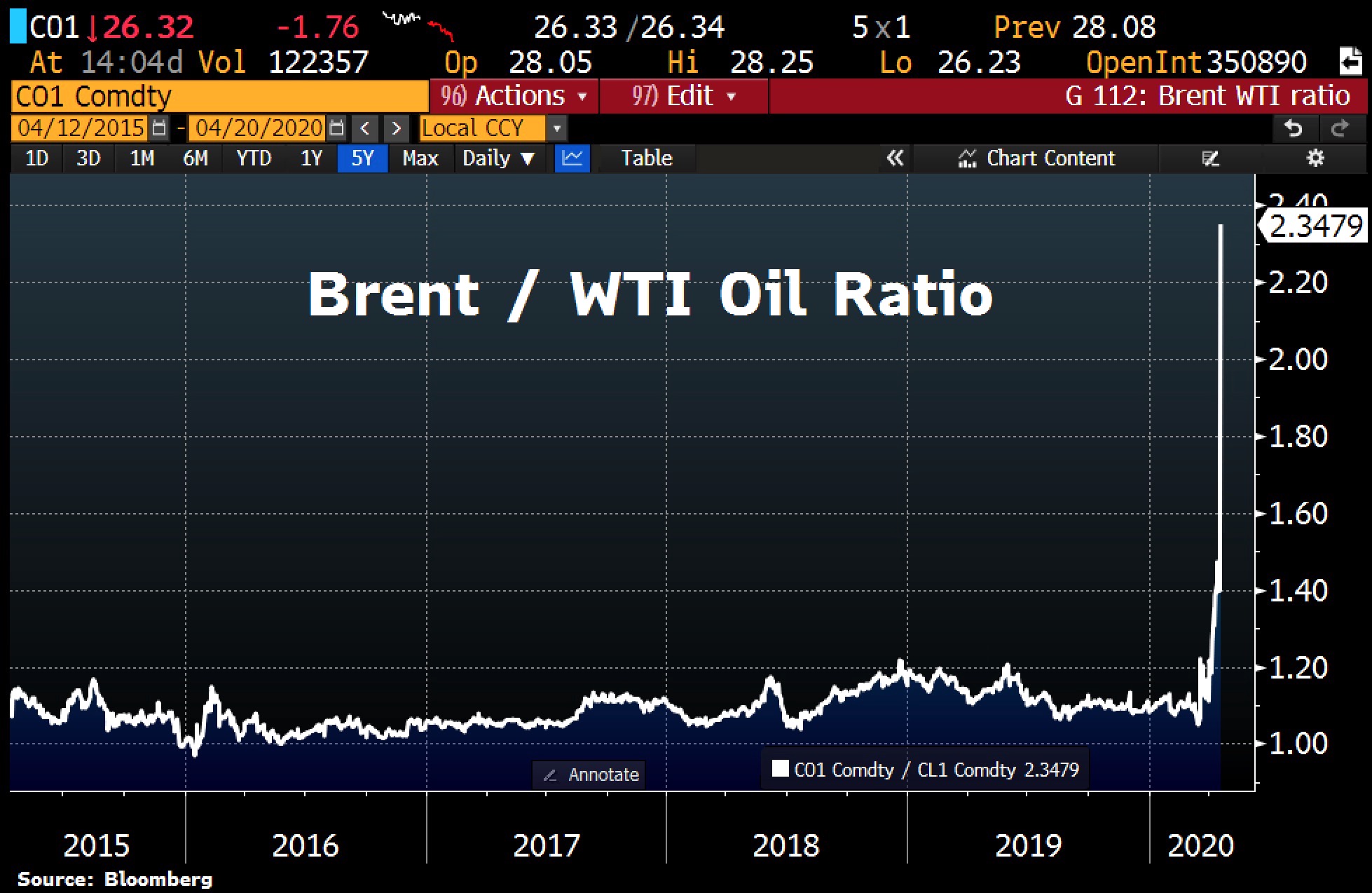 Brent nun 2x so teuer wie WTI!Jetzt könnte man entw. Short Brent oder Long WTI gehen...